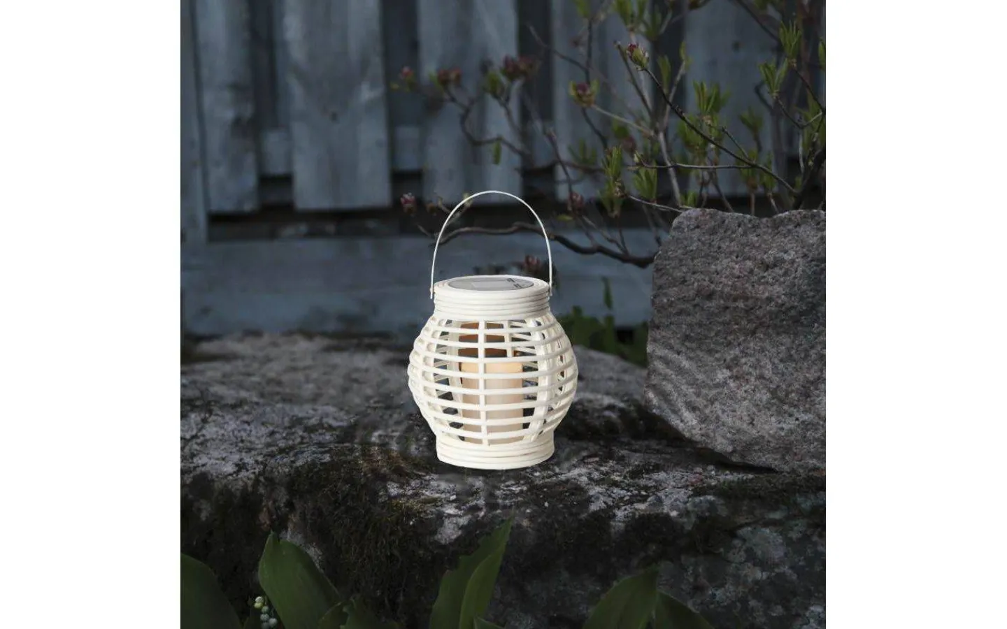 Rotang är en vit solcellsdriven ljuslykta med ett mini-blockljus i LED. Blockljuset är placerat inne i ljuslyktan och avger ett mysigt dekorationsljus när mörkret faller på. Denna solcellslampa går lika bra att ha ståendes på ett bord som hängandes i ett träd och blir en härlig dekorationsbelysning i din trädgård eller på uteplatsen.