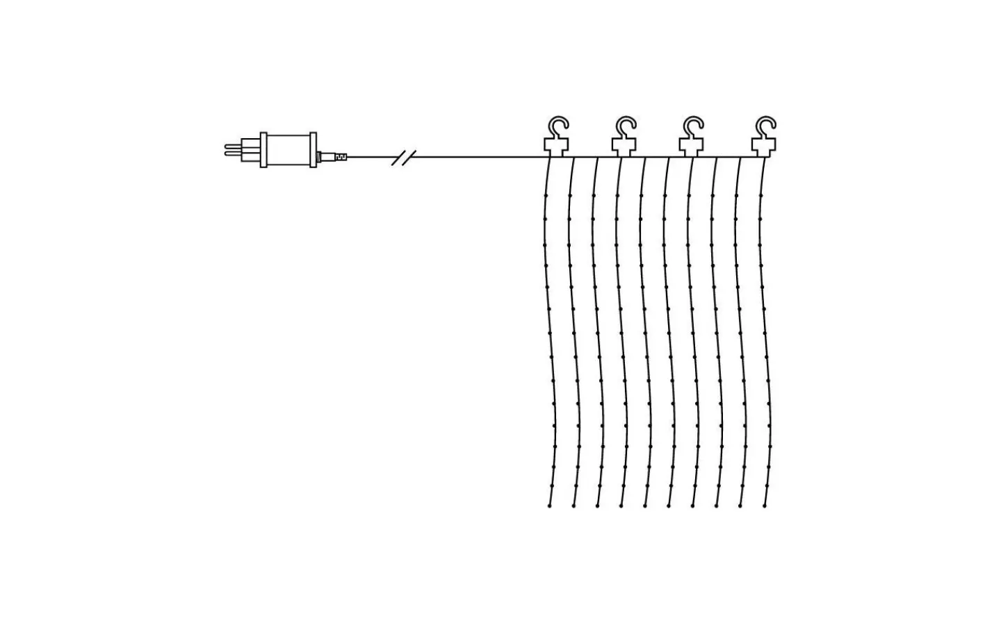 Sherrie gardinslinga för utomhusbruk från Star Trading har 200 LED-ljuskällor som är fördelade på 10 stycken slingor och som lyser i ett varmvitt sken. Krokar för lättare upphängning sitter längst upp på slingan.