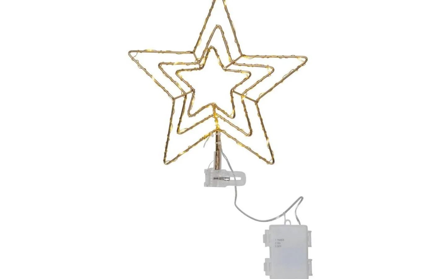 Topsy toppstjärna, från välkända Star Trading. Topsy har ett djup på 5cm som skapar en 3D effekt och som lyser i ett härligt varmvitt sken kommer denna vackra stjärna bli för din julgran. Batteridriven med klämma för enkel montering på julgranen. Stjärnan har en höjd på 28cm, en längd/ bredd på 26cm och har ett djup på 5cm