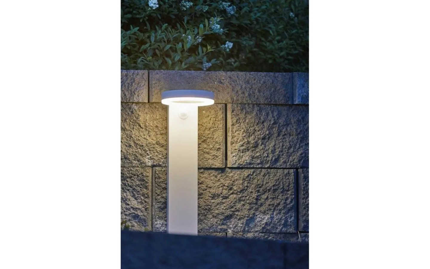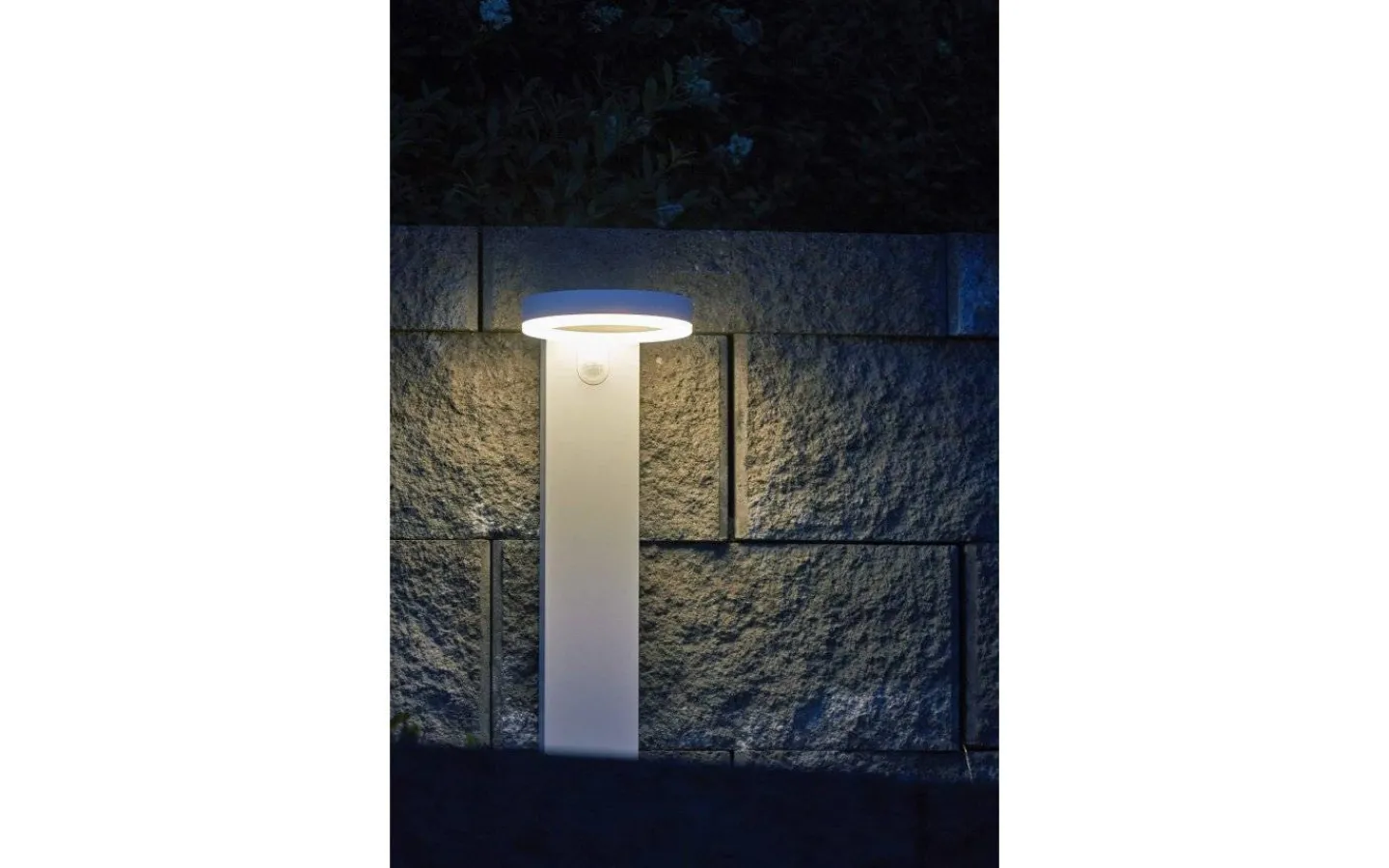Solcellsdriven gångbelysning som under natten och via rörelseindikation lyser upp med 500 Lumen i 25 sekunder och går sedan ner till 70 Lumen konstant ljus.