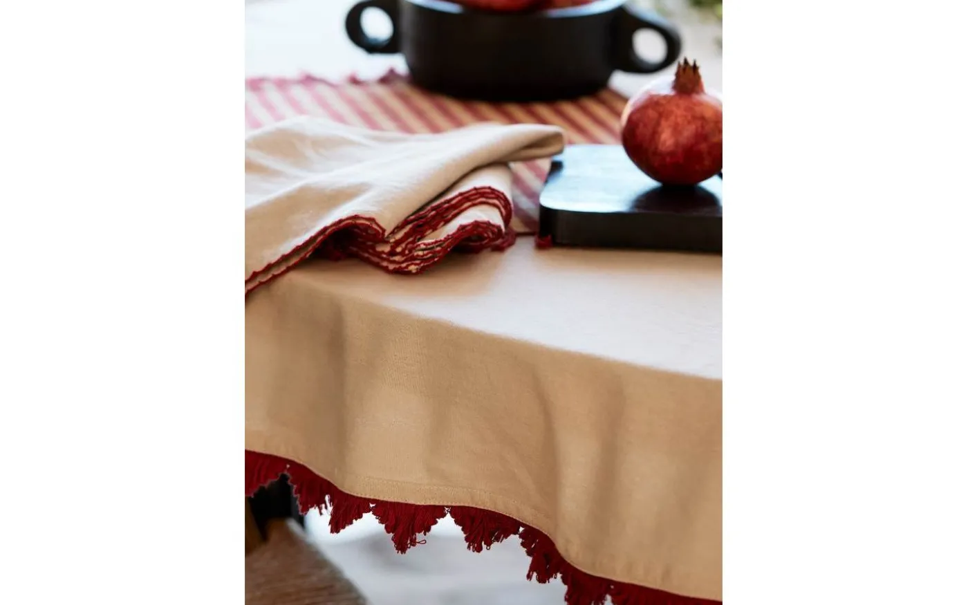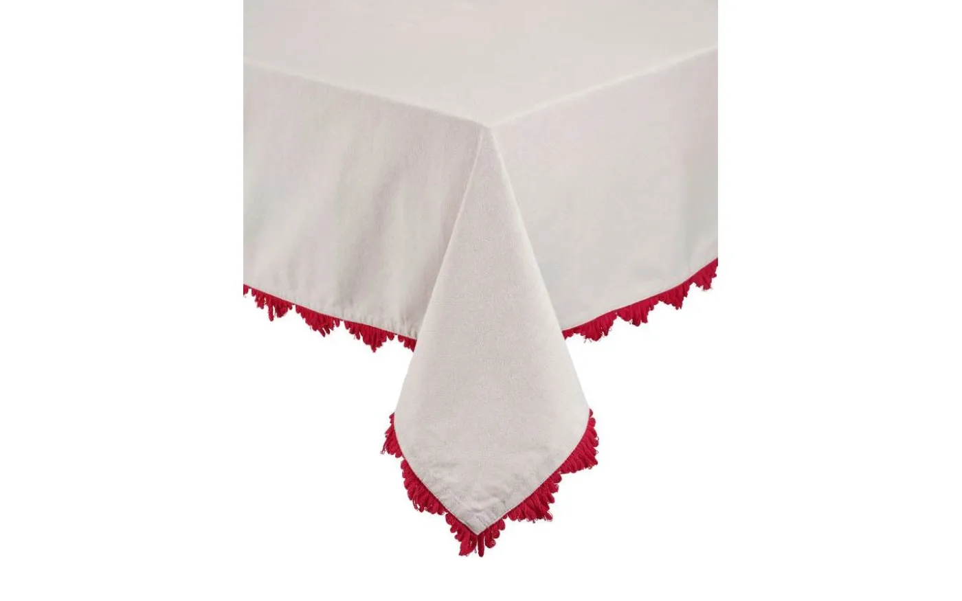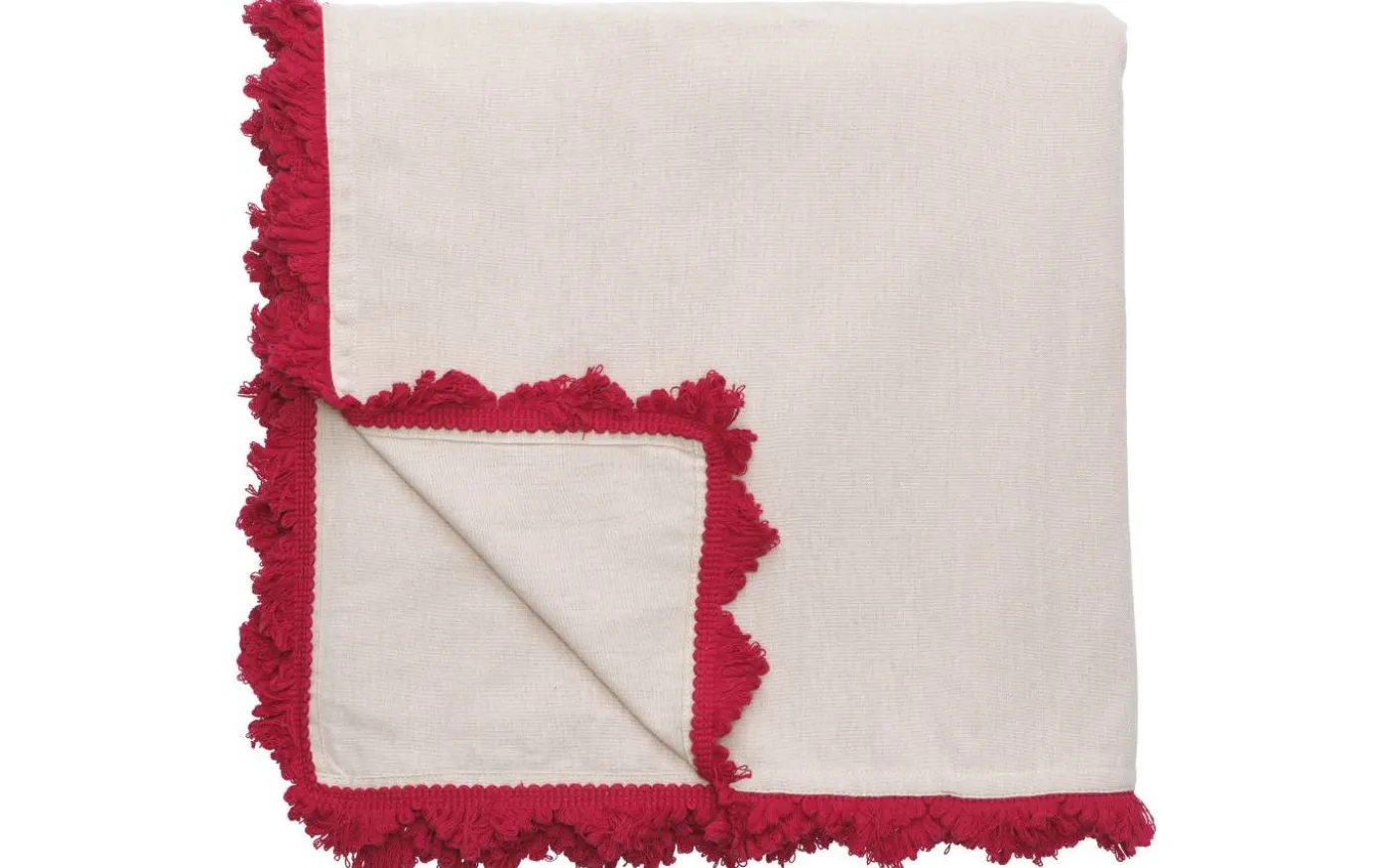 Vackra Stine bordsduk från Svanefors är en rund bordsduk av mjuk bomullskvalitet i en lätt tvättad känsla med vacker röd frans längs kanterna.