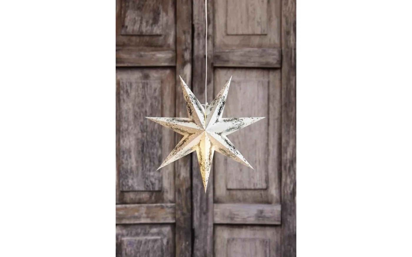 Papperstjärna i vitt med guldfärgade partier. Diameter på 75cm. Tekniskt: Stjärnan kräver en glödlampa med liten sockel (E14) om max 25W eller motsvarande i LED, ingår ej. Upphängning med 3,5m sladd med strömbrytare medföljer.
