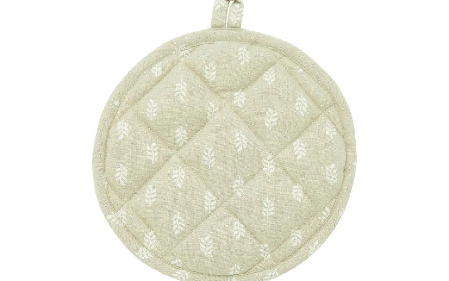 Rund grytlapp i bomull med blocktryckt mönster, mått 25cm i diameter och med en ögla att hänga upp den.