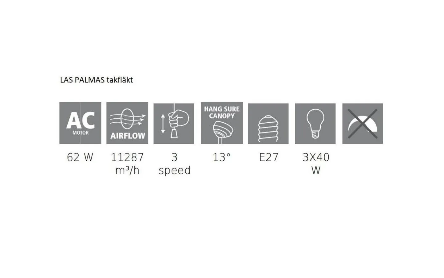 Las Palmas är en takfläkt med 3 lampor från välkända Eglo. Denna takfläkt har stomme i vitlackerad stål och blad av högkvalitativ mdf i vitt.