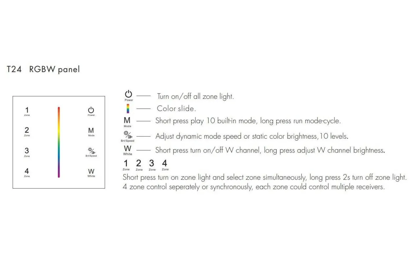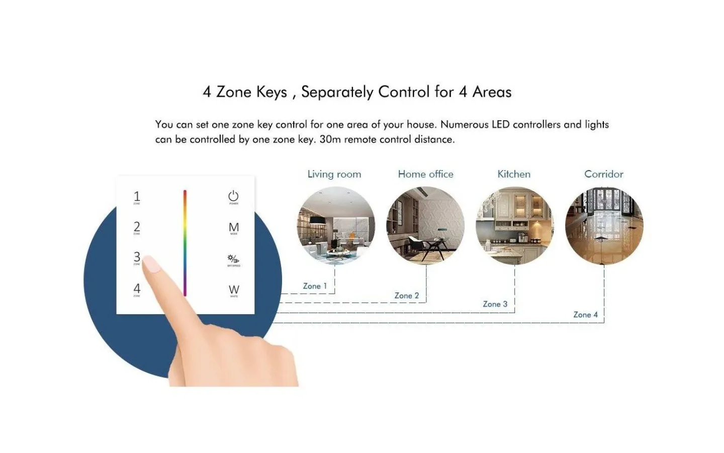 Väggfjärrkontrollen har förprogrammerade knappar för att styra 4 olika zoner. Varje zon behöver matchas mot minst 1 st V4 mottagare.