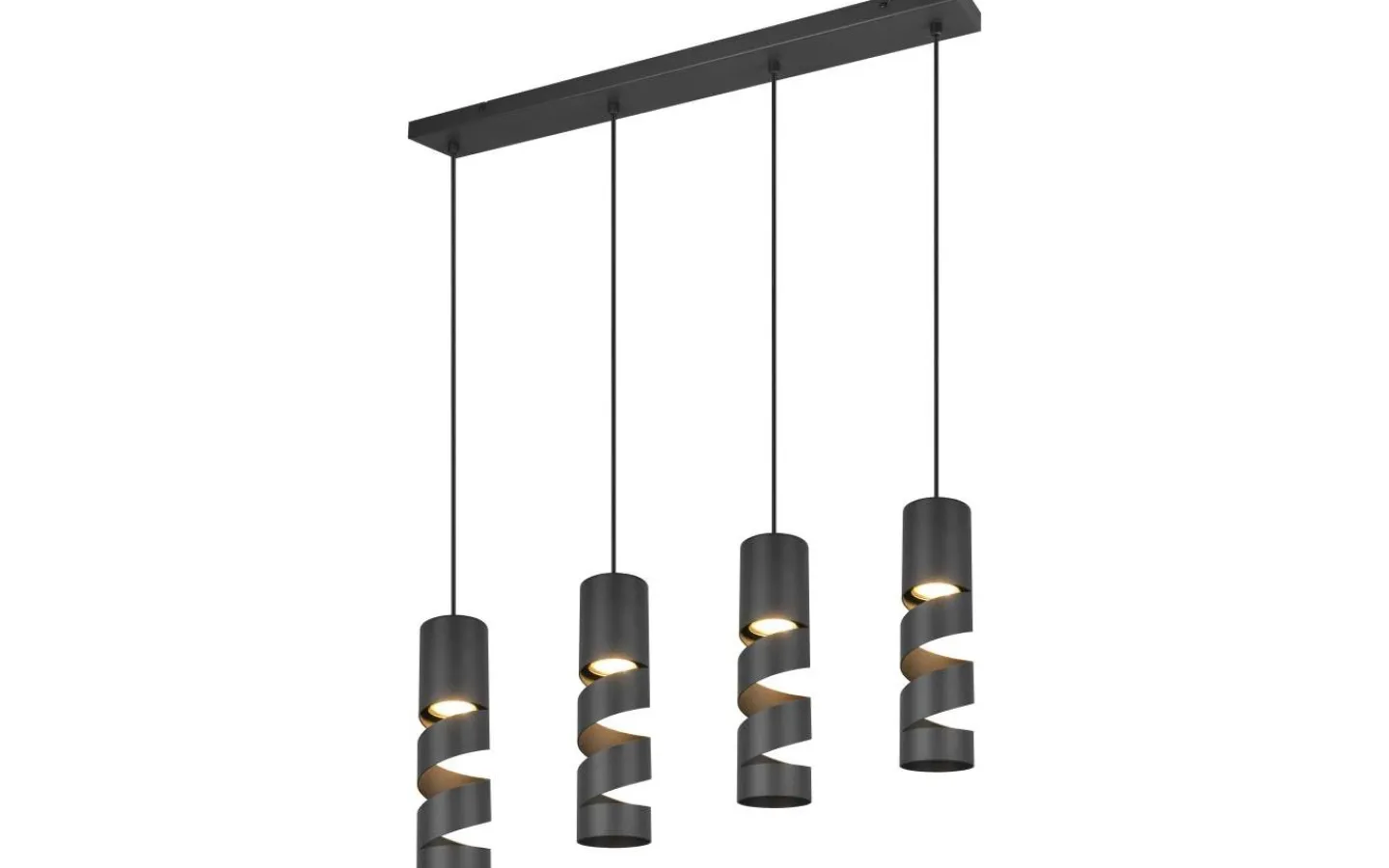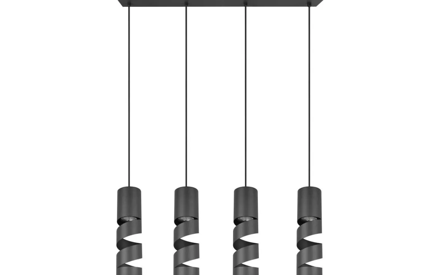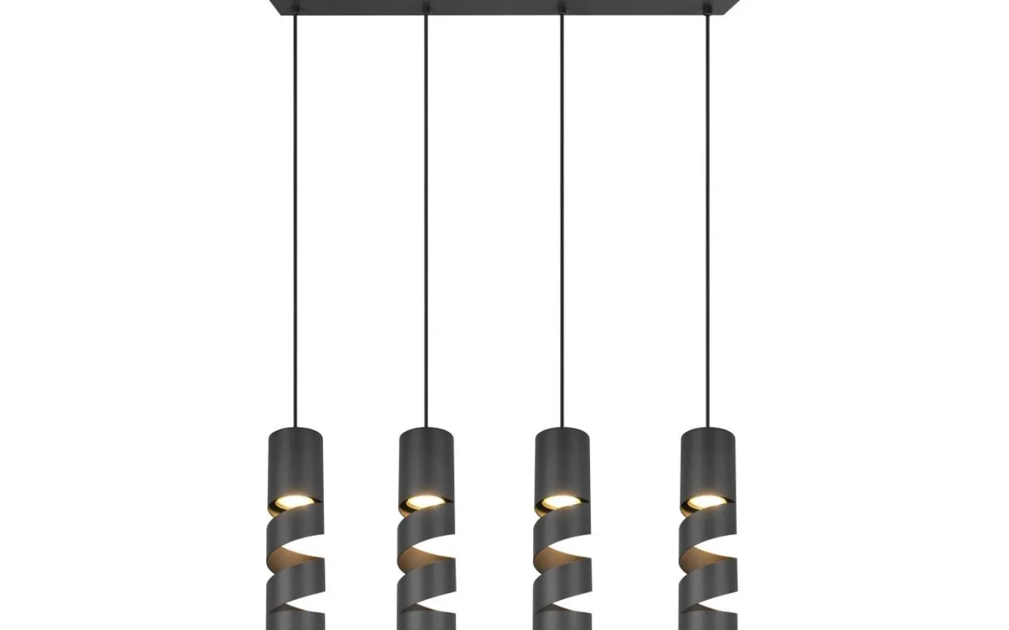 Upptäck pendellampan med fyra ljuskällor från STREAM-serien – ett fascinerande mästerverk som påminner om korkskruvarnas eleganta form. Med sin moderna men tidlösa design ger STREAM-pendellampan oöverträffad elegans till ditt hem. Skärmarnas smala, cylindriska form gör dem till det perfekta valet för belysning ovanför matbord eller köksbänkar. Med sitt mattsvarta utseende förhöjer den stilfullt alla interiörer och sätter smakfulla accenter. För modern och pålitlig belysning rekommenderas en LED-lampa. Den erbjuder hög ljuskvalitet, är mångsidig och övertygar med jämn belysning. Dess långa livslängd och låga värmeutveckling gör den till det perfekta valet för en mängd olika användningsområden. Ljuskälla: exklusiva 4x GU10 · max. 10W. Extra information: Justerbar i höjd, Takmontering, IP20, Lampa(or) ingår ej