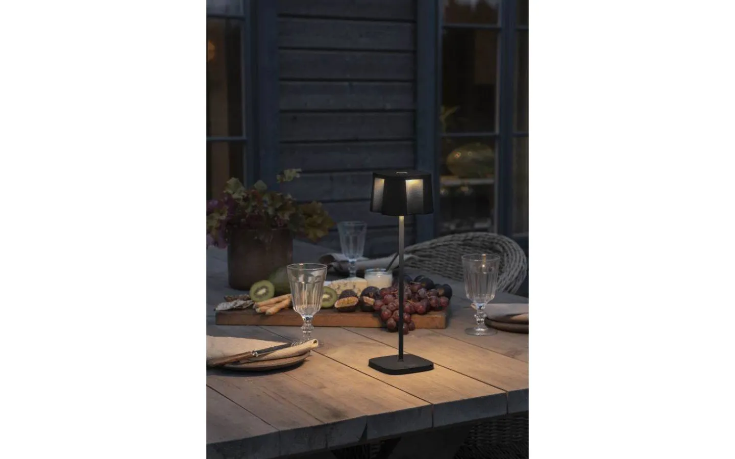 Nice är en batteridriven och uppladdningsbar bordslampa i aluminium från välkända Konstsmide. Perfekt till uteplatsen, balkongen eller att ta med i husvagnen! Den inbyggda dimmerfunktionen gör att du enkelt kan justera ljusstyrka mellan så lite som 10 lumen upp till 120 lumen, perfekt för att skapa en härlig atmosfär under sommarkvällar på uteplatsen!