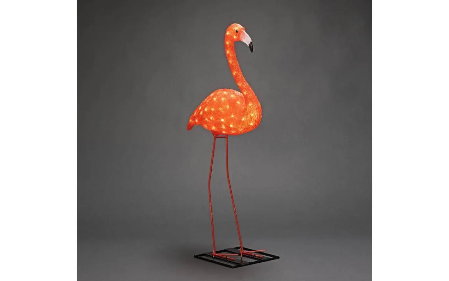 Härligt utomhusdekoration från Konstsmide i form av en vacker flamingo. Med sin höjd på 110cm blir denna flamingon en maffig pjäs att placera i trädgården. Flamingon har 96st små LED-lampor som lyser upp denna vackra pjäs i ett härligt varmvtitt ljussken.