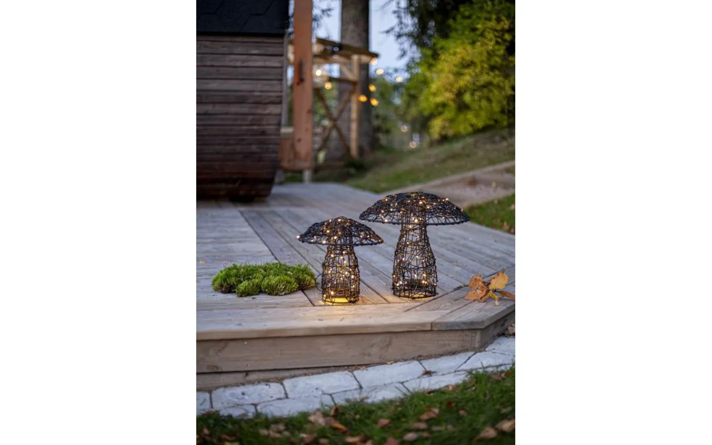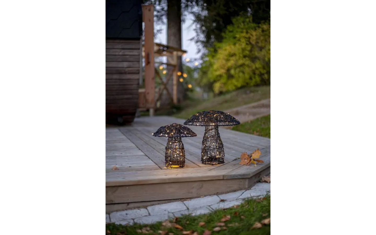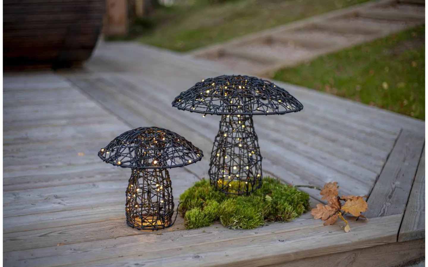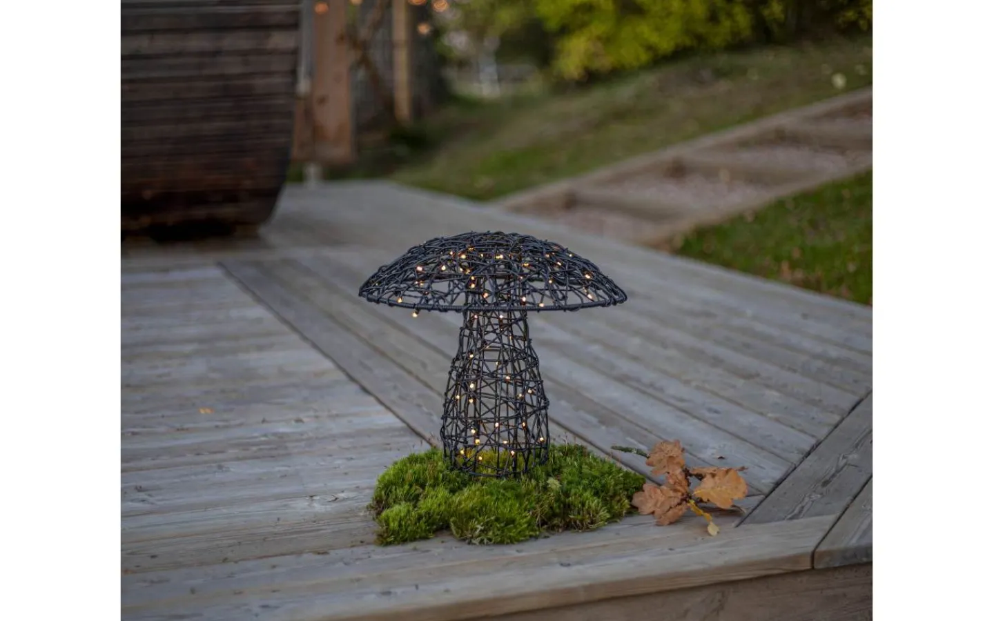 Otto från Star Trading är en dekorativ svamp för utomhusbruk tillverkad i svart konstrotting med metallstomme. Den handflätade lampskärmen gör varje dekoration unik och slingan är snyggt invirad i svampen, vilket ger ett stämningsfullt och levande sken.