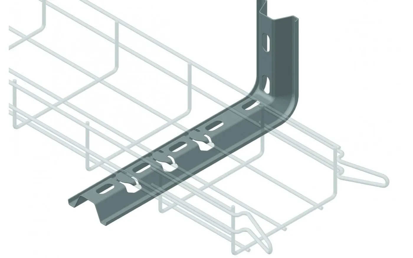 Väggkonsol för elförzinkade trådstegar. Trådstegen låses mot konsolen med klämmor som böjs ned. Kan kompletteras med ändskydd E11 337 90.