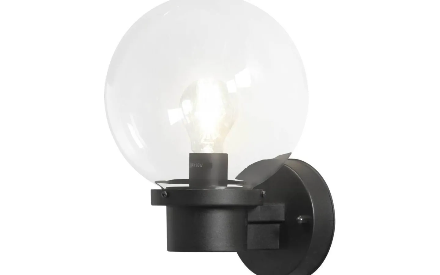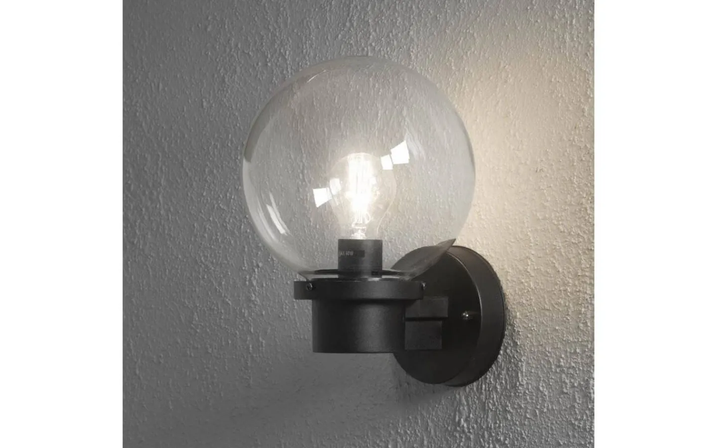 Denna stilrena vägglykta är gjord av svart plast med en klar kupa i glas och installeras smidigt med 230V.