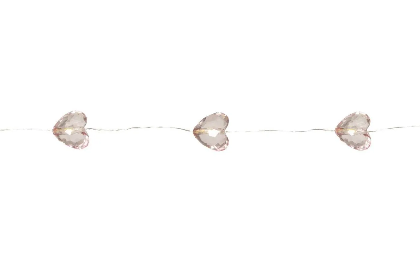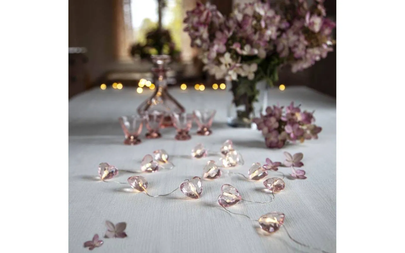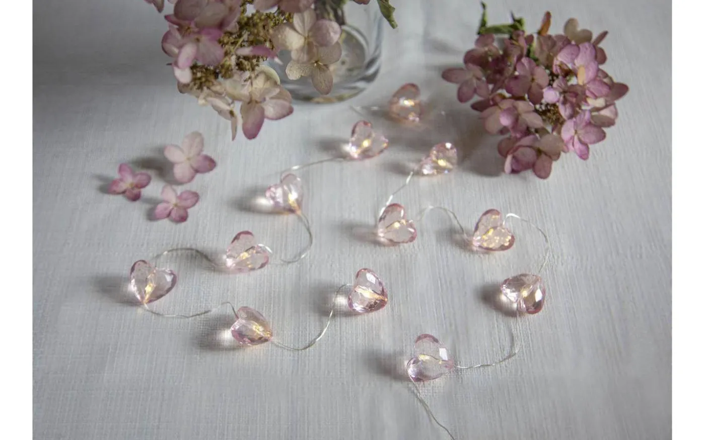 Vacker batteridriven ljusslinga med fasettslipade rosa hjärtan. Med tunn silverfärgad metallkabel och 12 varmvita LED, batteridosan drivs med 2 st AA batterier och har timerfunktion. Fin dekoration till dukning mm. 2 batterier AA ingår ej. Batteritid ca. 100h.