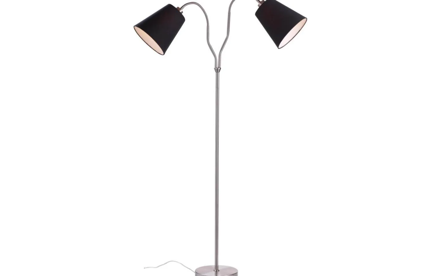 Golvlampan har separata strömbrytare på varje lamphuvud och en transparent sladd.