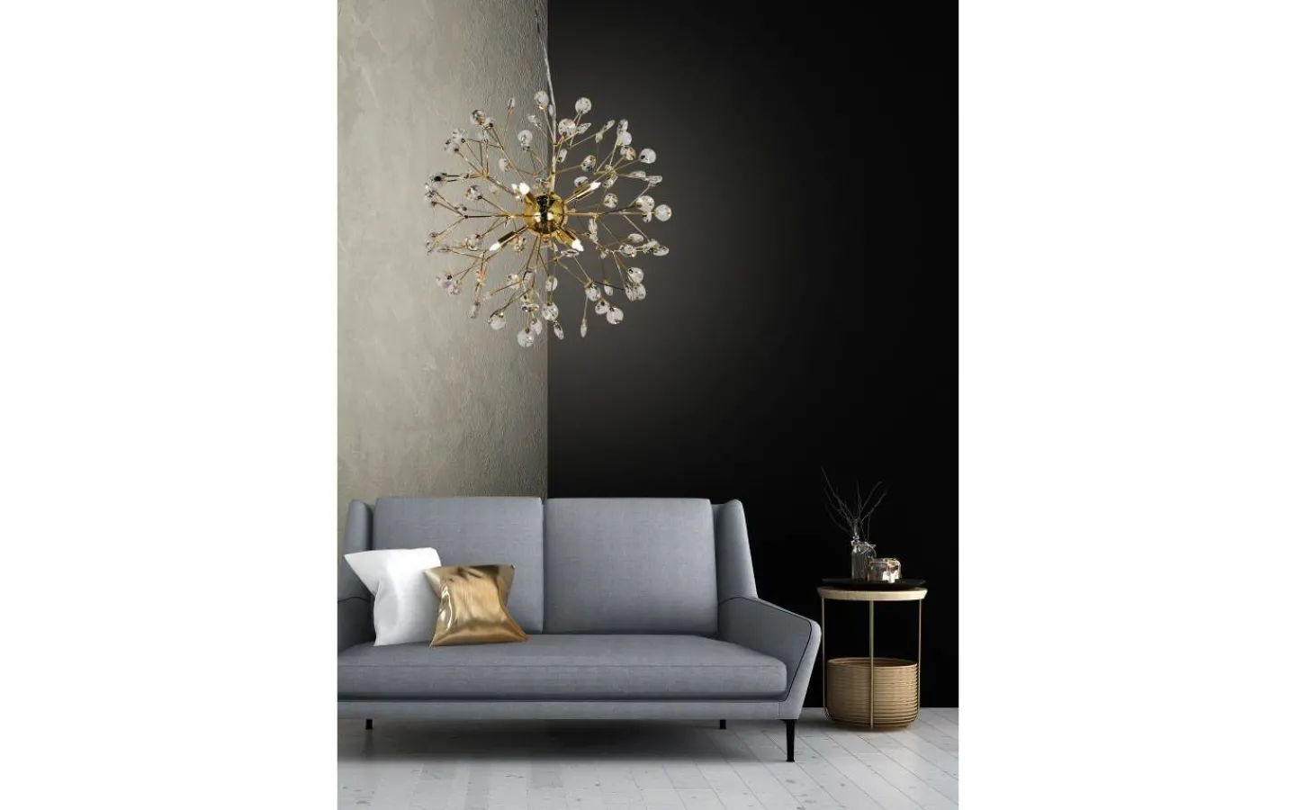Viva taklampa i mässing kombinerad med dekorativa klara prismor / kristaller som är genomgående i hela lampan. Lampan är för 6 x 25W G9 och sprider ett spektakulärt ljus genom kristallerna när lampan är tänd, ljuskällor ingår ej. Takkopp av metall. Krokupphäng med kopplingsplint, lamppropp kan monteras.