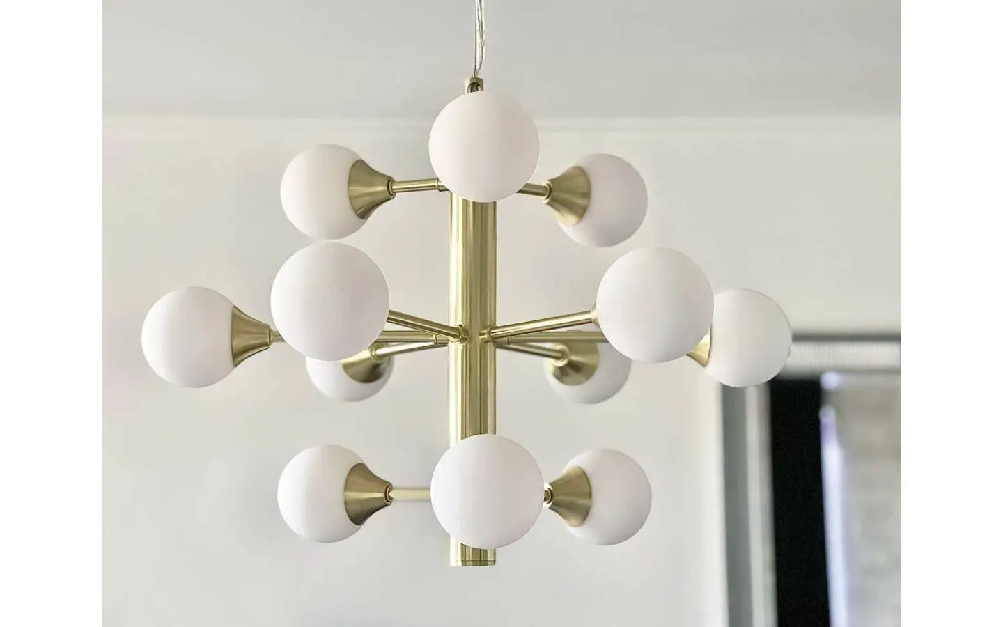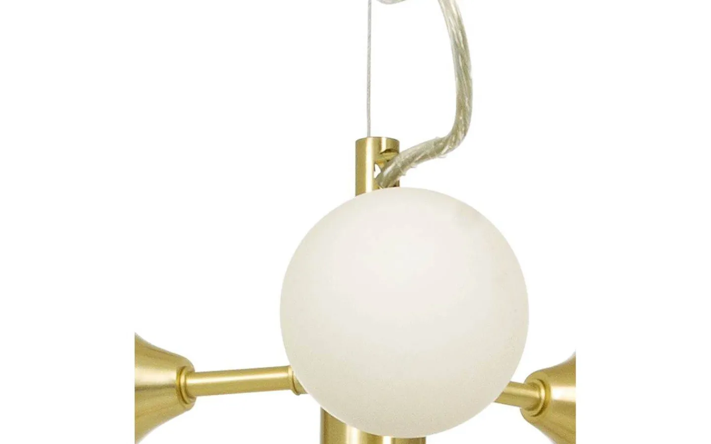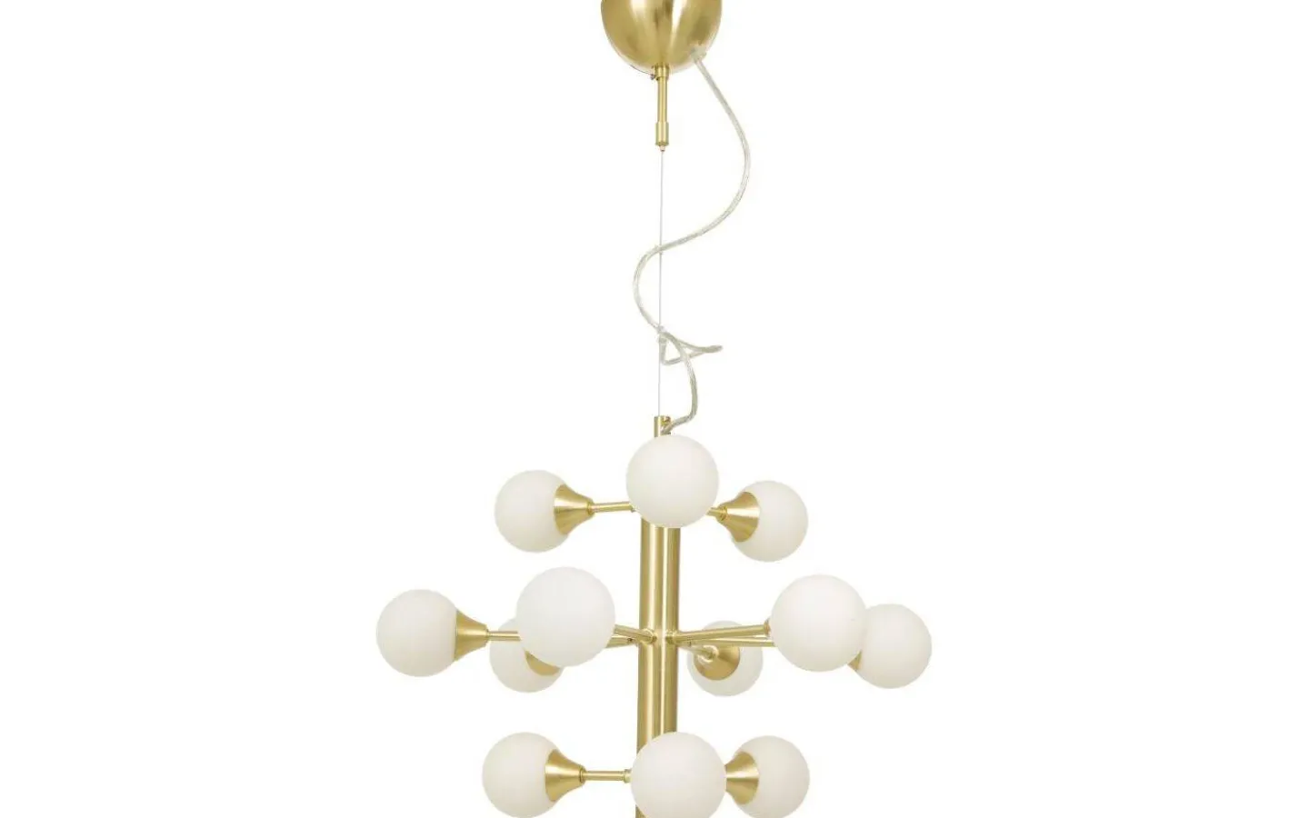 Cosmos taklampa i matt mässingsfärgad metall med 12 opalvita glaskupor. Takkopp i mässing för krokupphäng och kopplingsplint, lamppropp kan enkelt monteras. Max 12 x 25W G9, ingår ej. En modern lampa som passar såväl över matbordet som soffbordet.