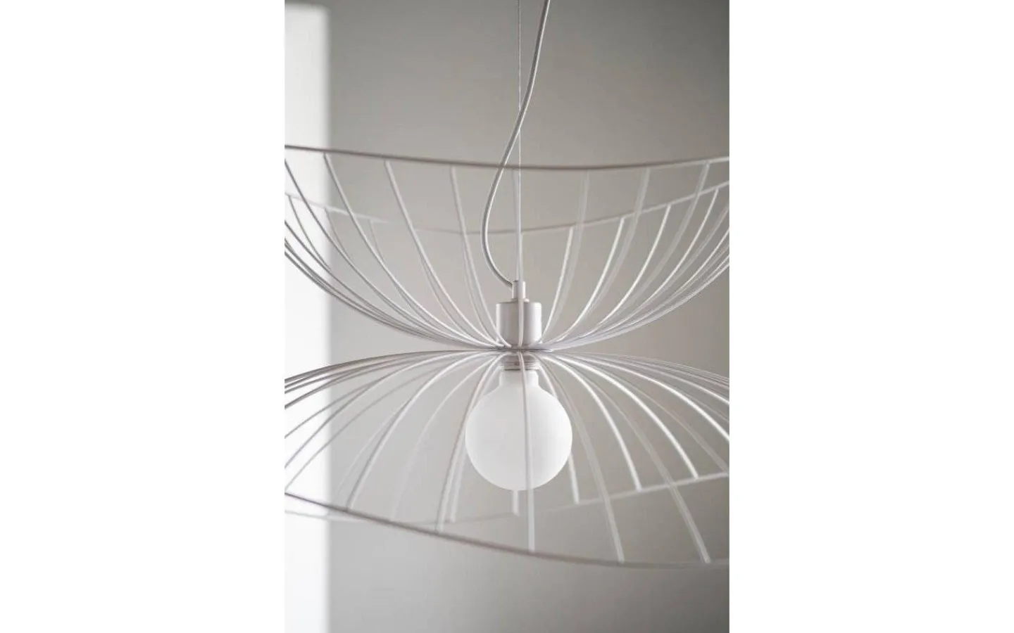 Mjuka och grafiska taklampan Ray i mattvitlackad metall som likt en rocka är vågformad i ytterkant. Välj själv hur du vill arrangera de två skärmarna, ovanpå- eller inuti varandra för att få en lägre pendel. Lampan har en 120 cm lång vit textilkabel med vajer samt matchande takkopp i mattvitlackad metall.