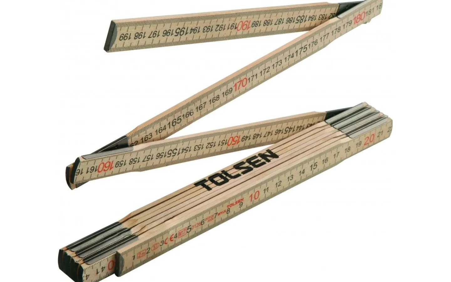 Tumstock av trä med meterskala. Millimetermarkeringar med färgmarkerat decimeterintervall.