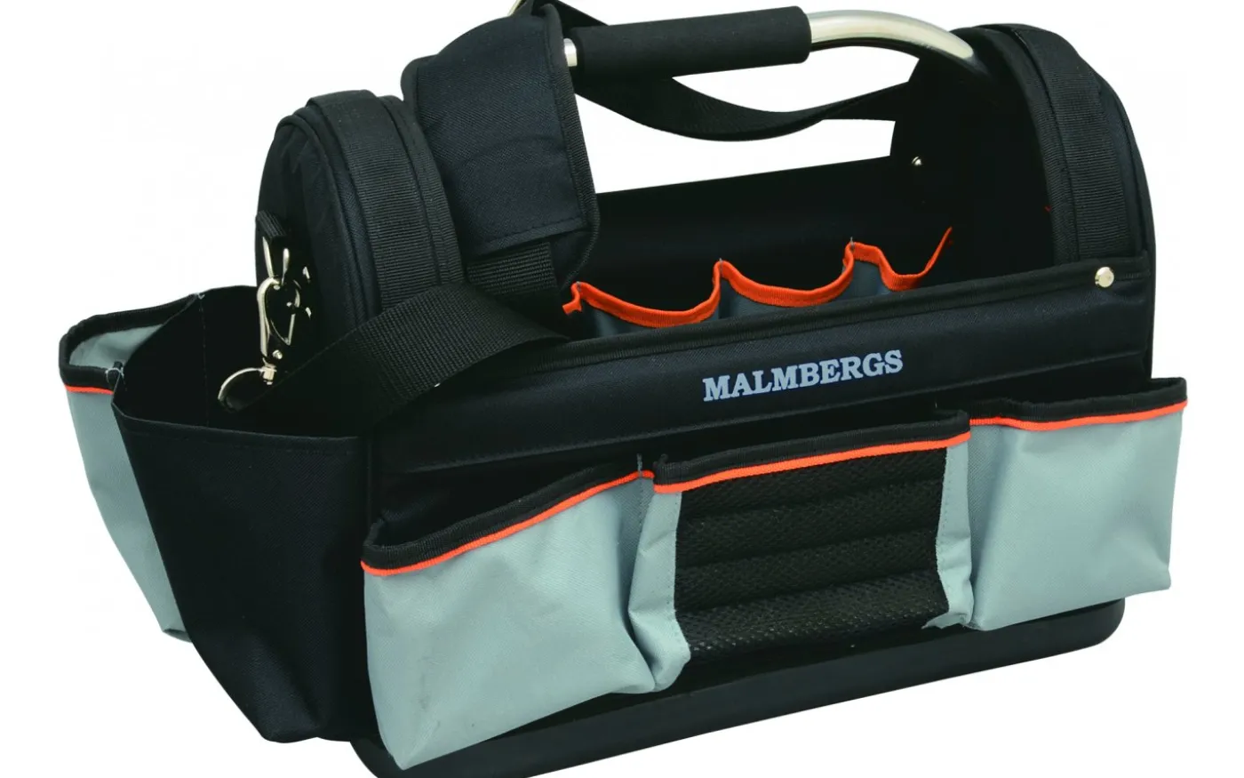 Verktygsväska i kraftig polyester med plastbotten. Med 10 innerfack samt låda för verktyg. 8 ytterfickor, 3 sidofack, 1 sidoficka för pennor m.m. Vadderat bärhandtag och axelrem.