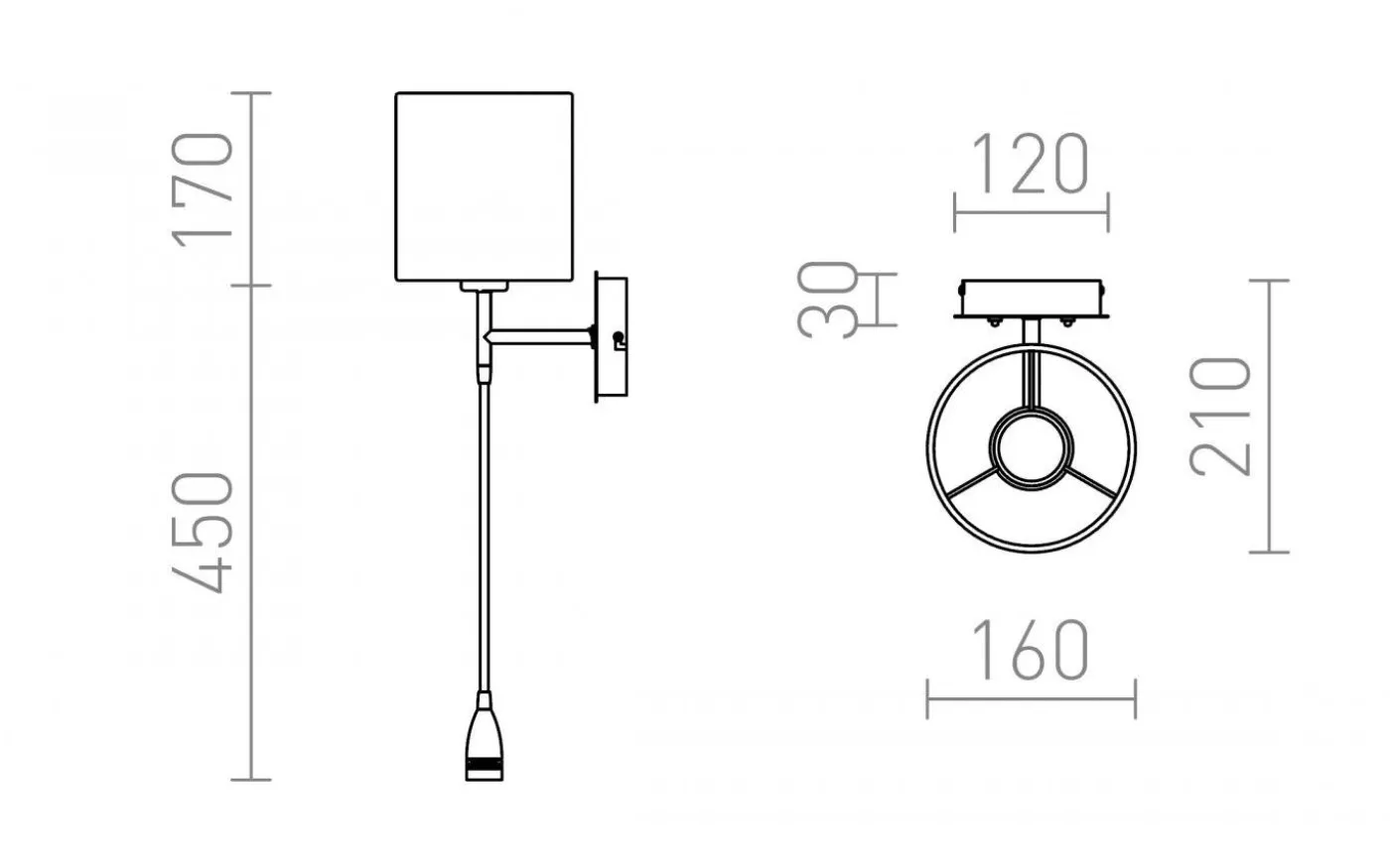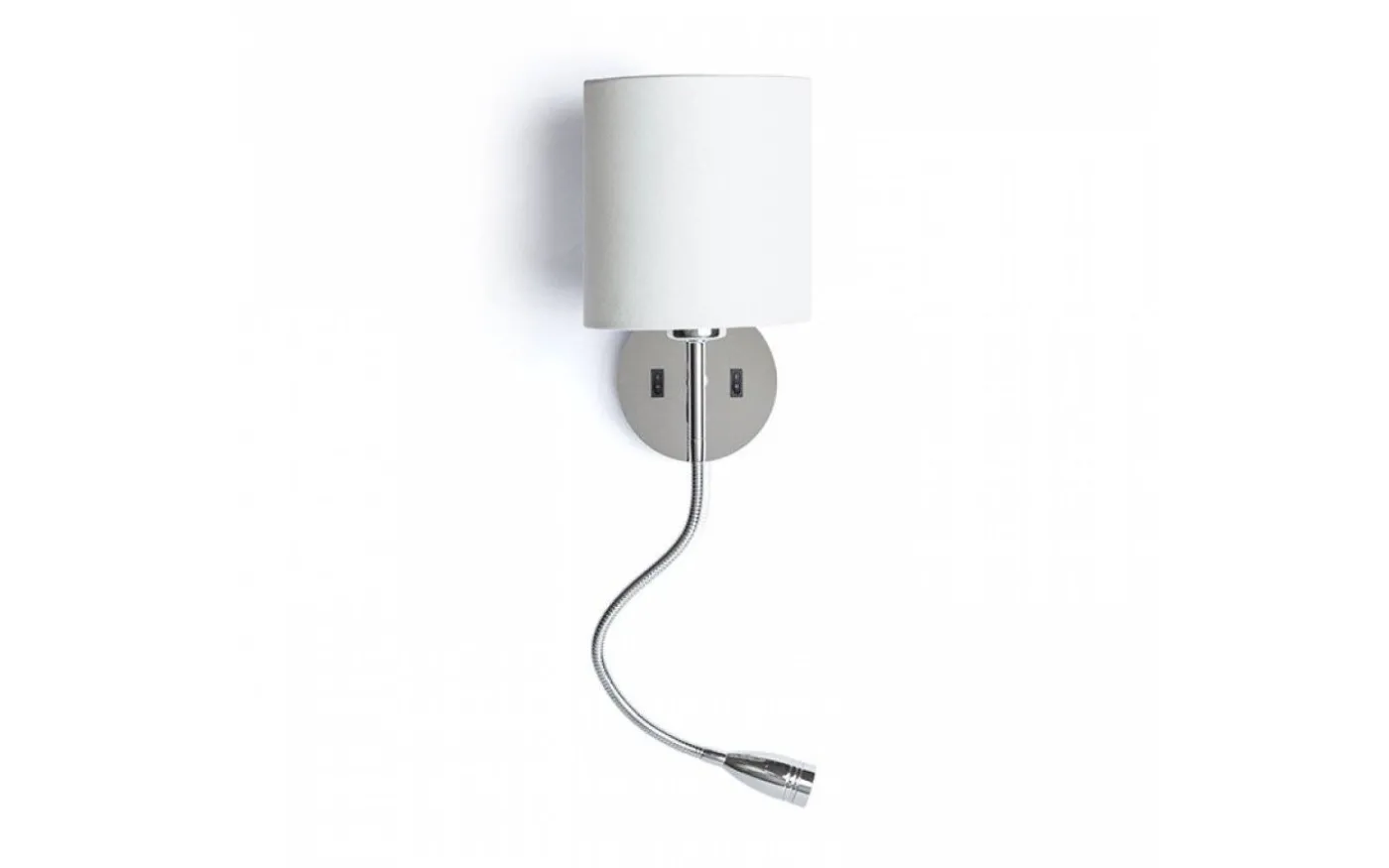 Vägglampa med textilskärm och LED-läslampa på svanhals. Båda ljuskällorna kan tändas och släckas individuellt med varsin brytare som sitter på basen.