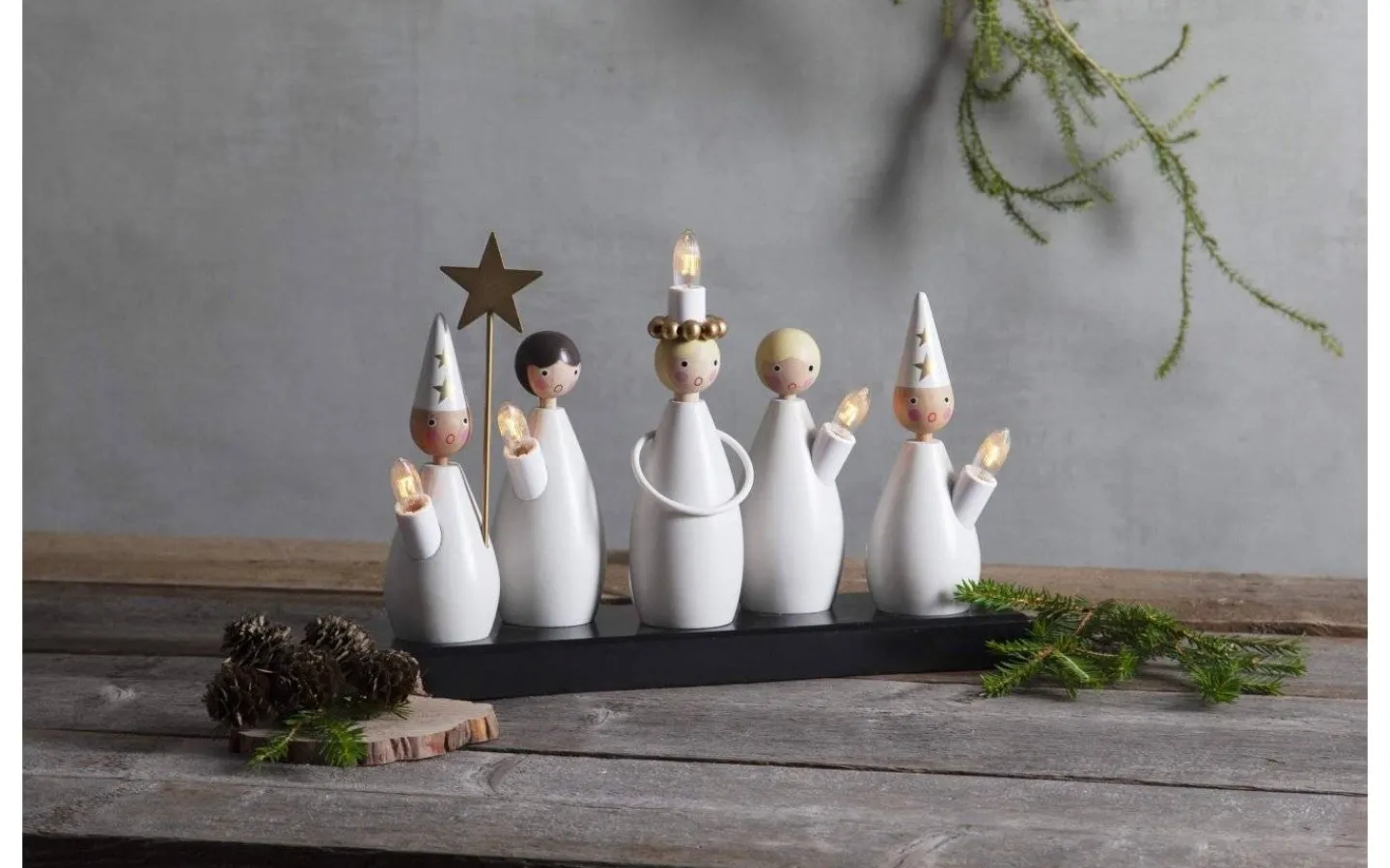 Träljusstake med Lucia, två tärnor och två stjärngossar, en stjärngosse håller i en målad guldstjärna i metall. Lucia har en krans av guldmålade träkulor. 5 ljuskällor. Placera på en skänk eller i ett fönster för att sprida en härlig julstämning i hemmet.