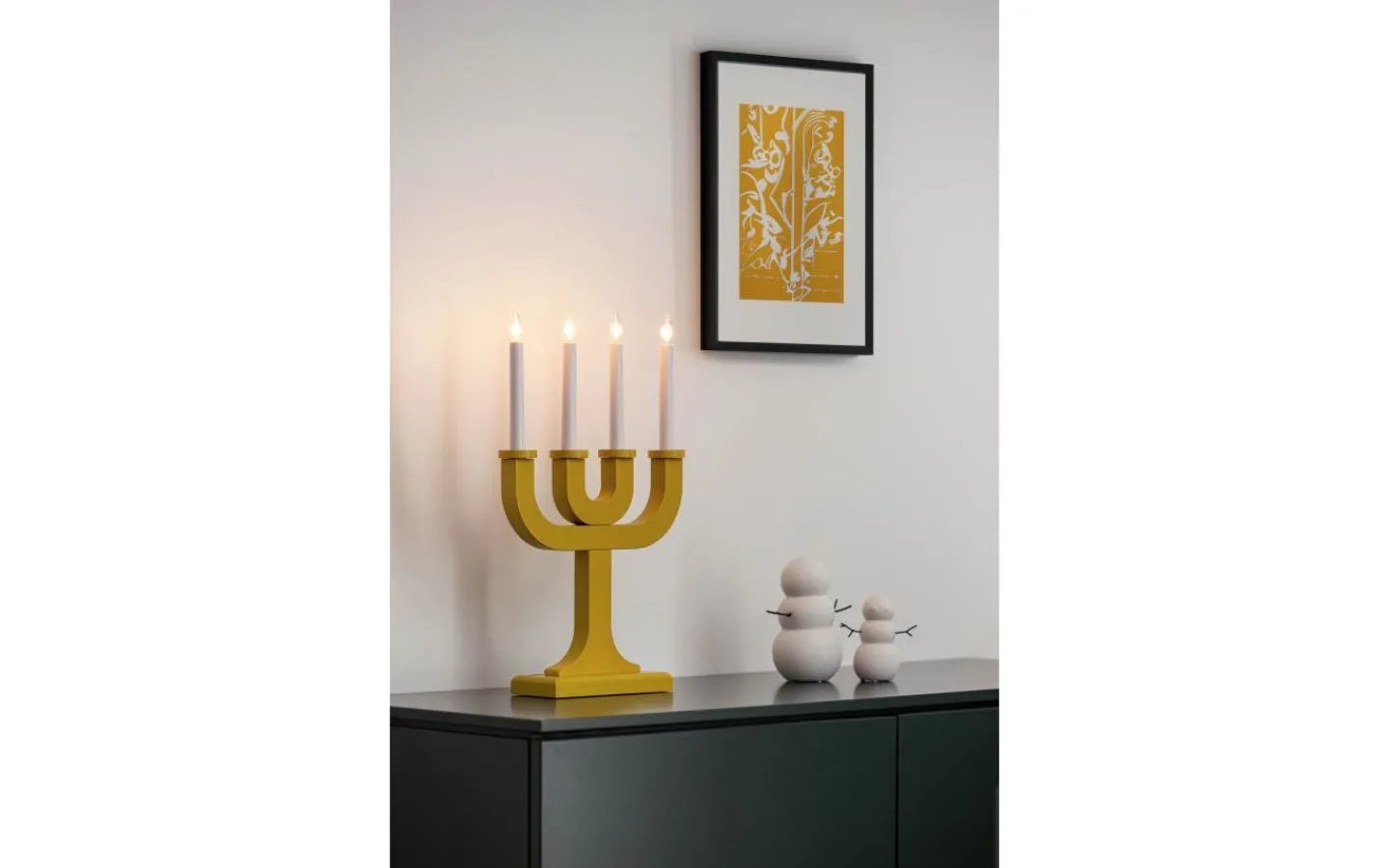 En gul adventsljusstake som vågar ta plats – stilren och modern med fyra ljus. Den lackade träytan skapar vacker kontrast mot det varma ljuset och ger ett elegant uttryck i både klassiska och minimalistiska hem.