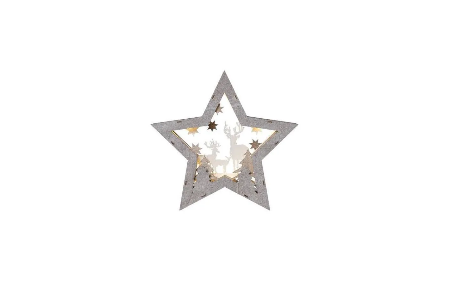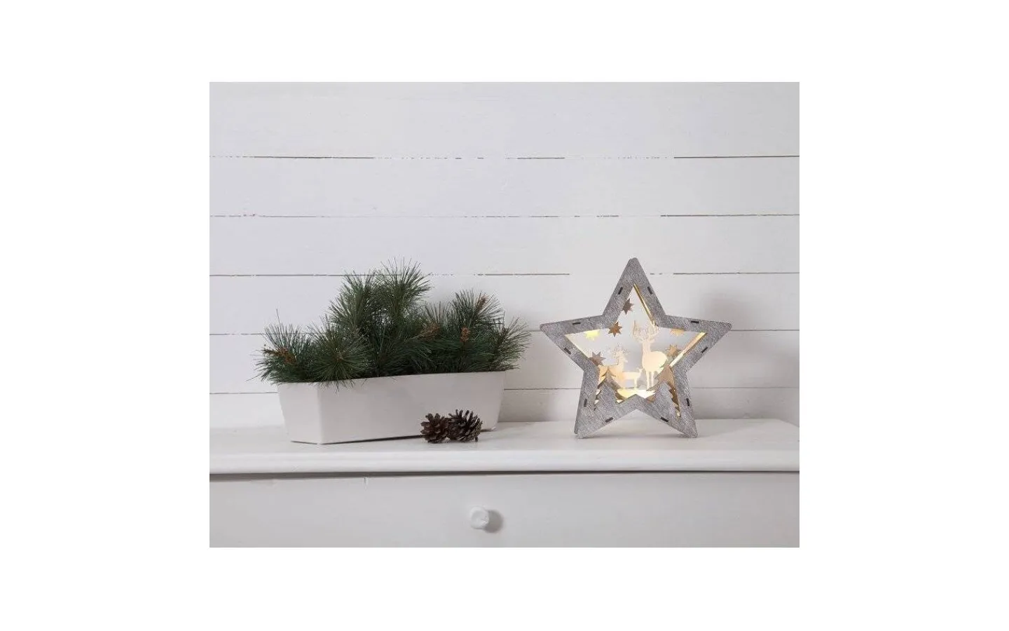 En batteridriven bordsdekoration stjärna som har 10 st LED-lampor som ej är utbytbara och lyser med ett varmvitt sken.