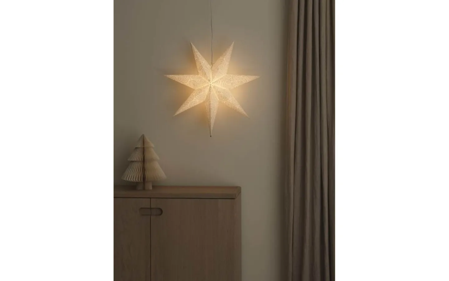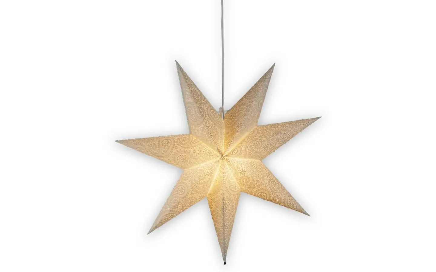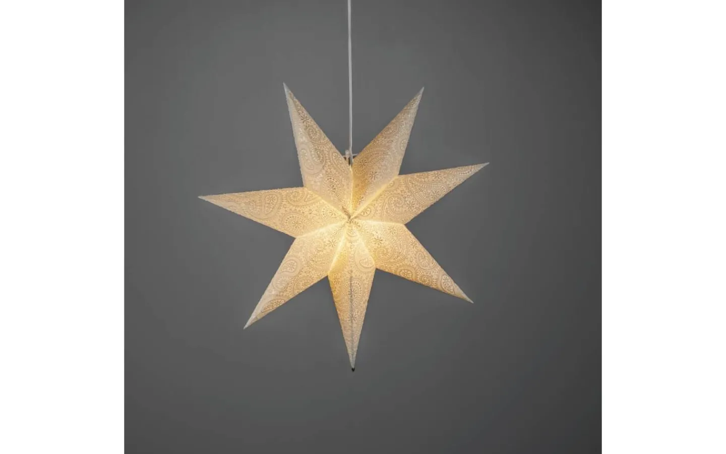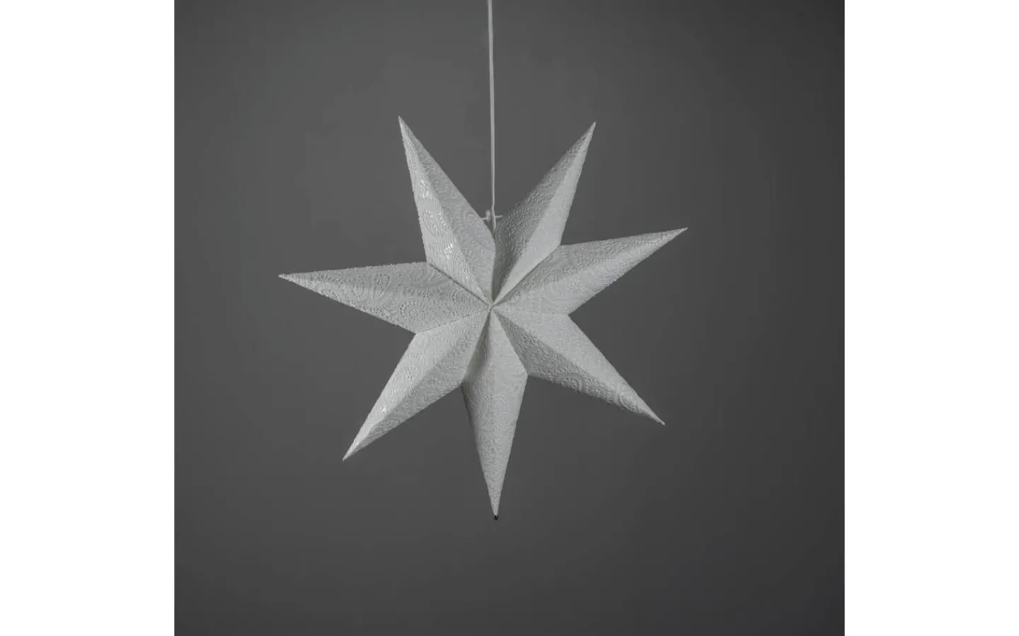 Hängande adventsstjärna med vitt spetsmönster, 7 uddar. Sladdställ med 5 meter anslutningssladd ingår, E14-sockel. Sladdströmbrytare. Diameter 60 cm