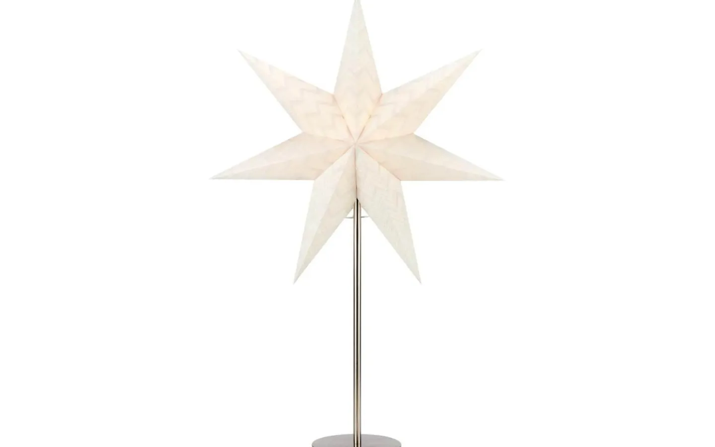 Admira julstjärna från Markslöjd har en stomme av silverfärgad metall och stjärnan av papp. Julstjärnan kommer komplett med en 2m kabel med strömbrytare på sladd och stickkontakt för vägguttag.