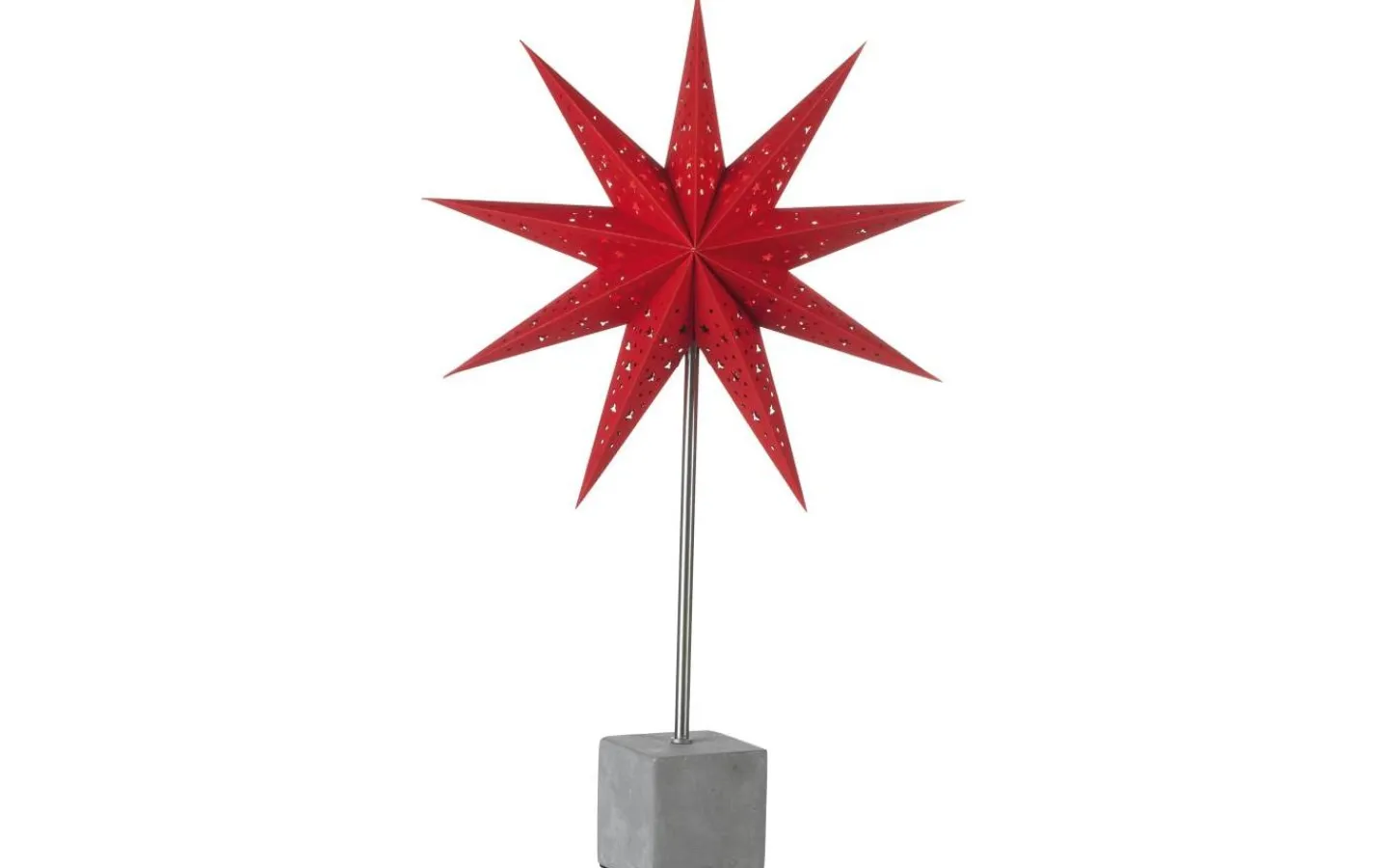 Hård bordsstjärna från Markslöjd har en fot i betong och skärmen av papp. Stjärnan kommer komplett med en 2m kabel med strömbrytare på sladd och stickkontakt för vägguttag.