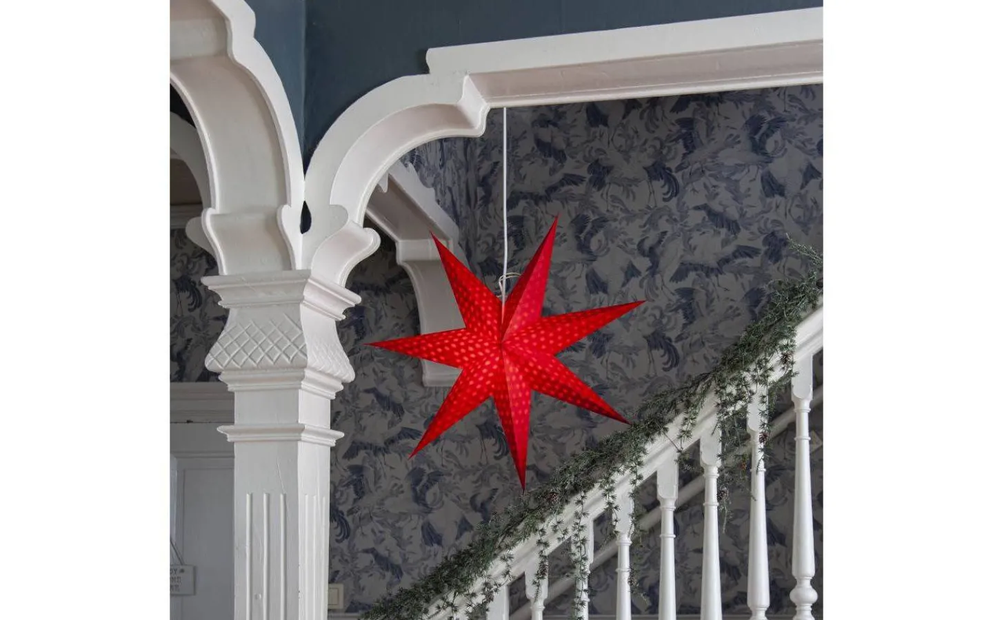Magisk adventsstjärna som är tillverkad av papper från återvunnet bomullsspill från t-shirt tillverkning. Vattenstämplat mönster i form av prickar. Stjärnan sprider stämning och ger hemmet den där speciella advent och julkänslan. Kan hängas både i fönster och mot en vägg.