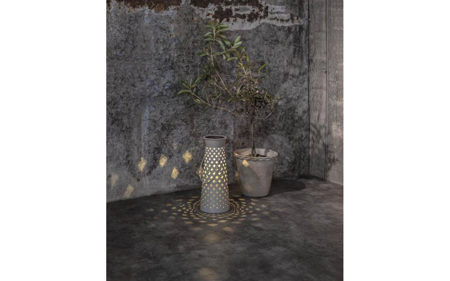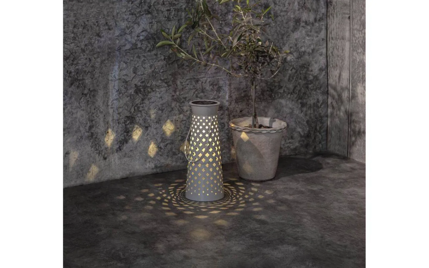 Romby solcellslampa från Star Trading är en snygg solcellslykta gjord i grå metall. Det varmvita ljuset lyser vackert genom det stansade rombmönstret och bildar en vacker ljusbild.