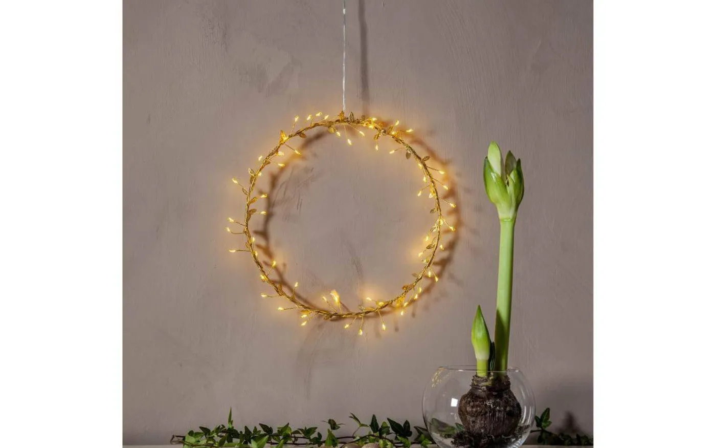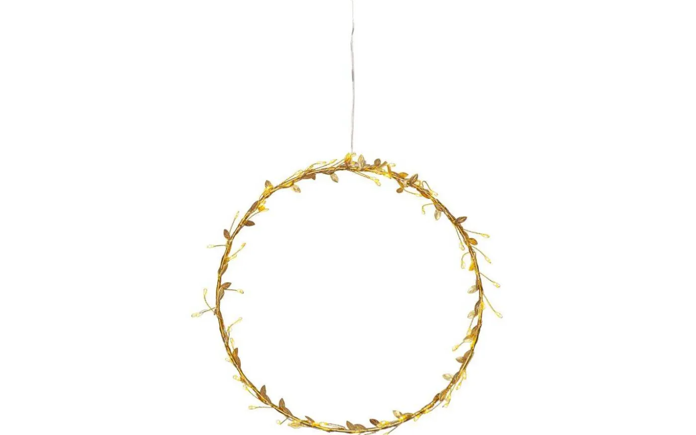 Winny från Star Trading är en vacker och stämningsfull krans med guldfärgade löv i polyester. Kransen är försedd med 60st små LED-lampor som lyser i ett härligt varmvitt ljussken.