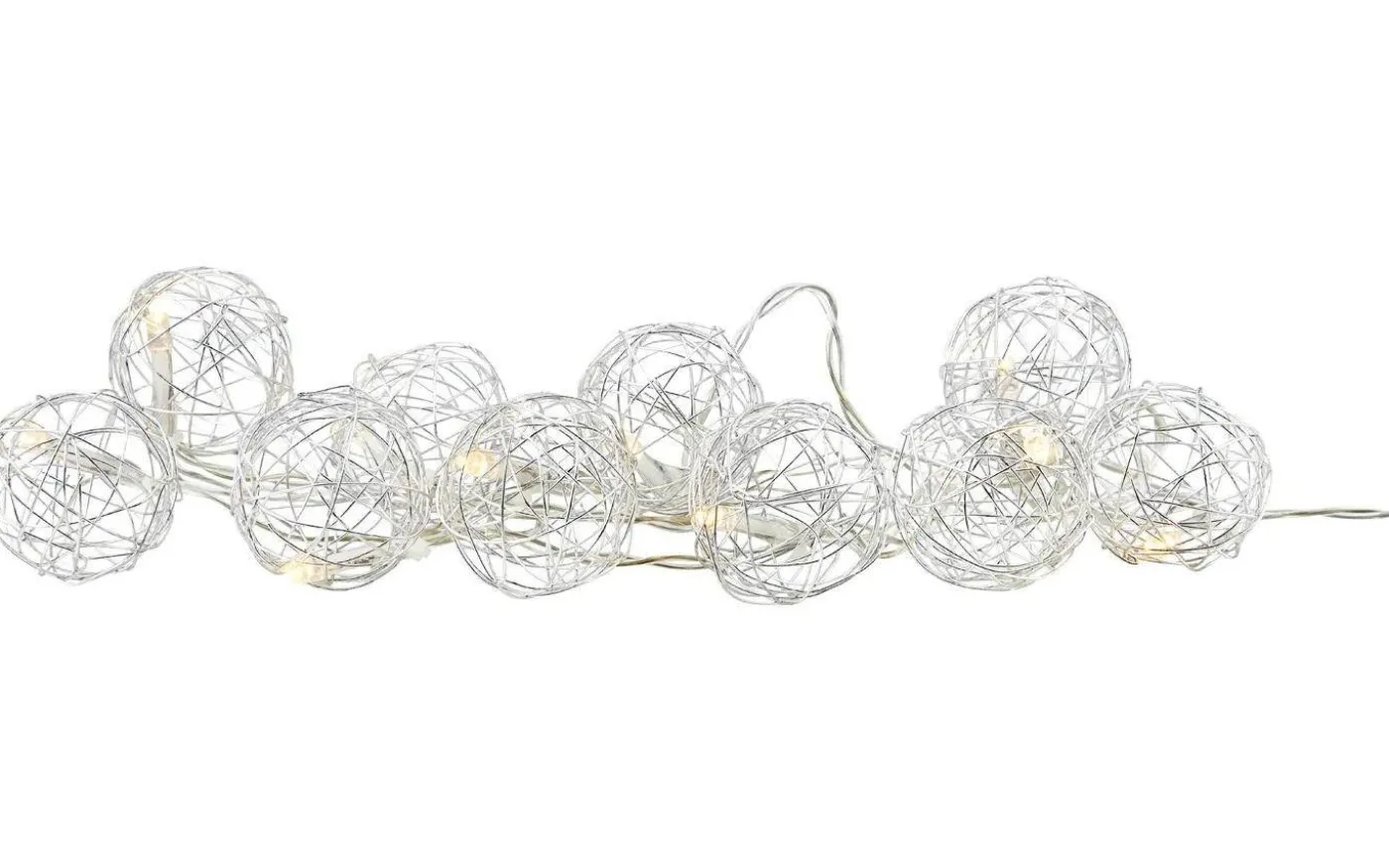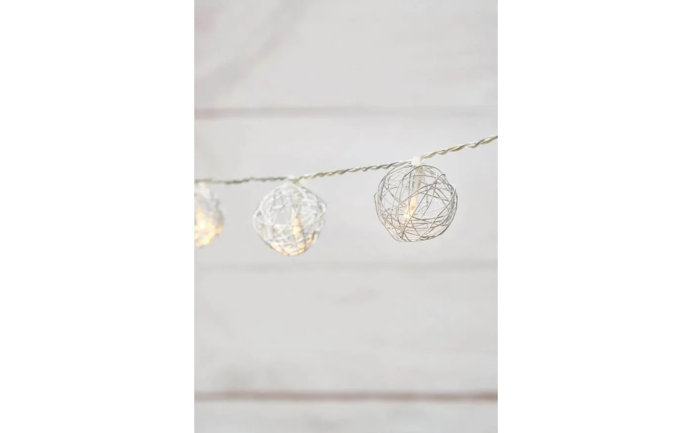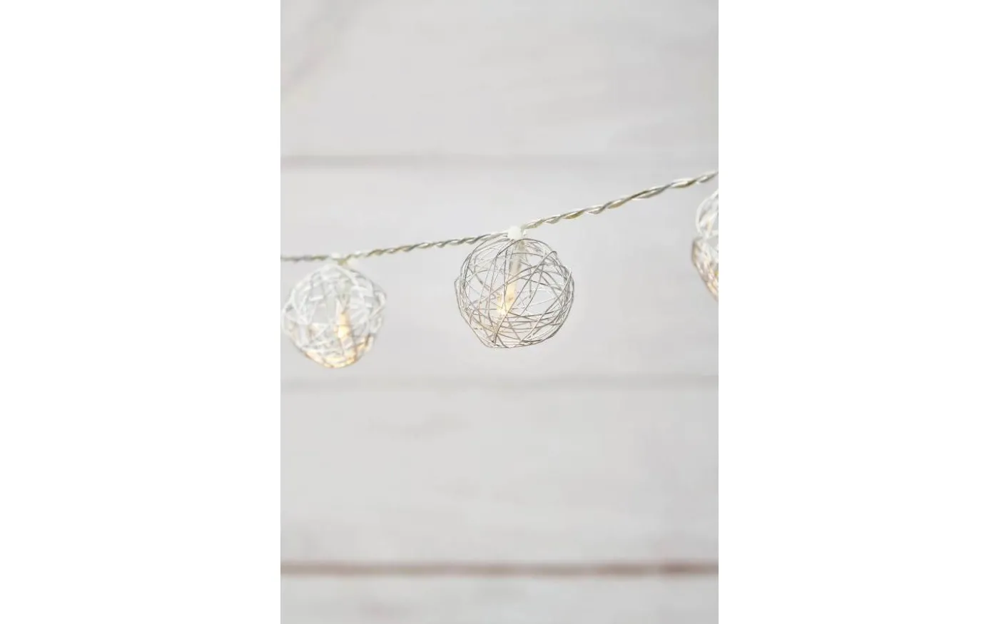 Ljusslinga med 10 ljusbollar med virad metall i silverfärg. Ljusslingan är 135 cm lång och drivs av batterier. Tekniskt: Ljusslingan har fast LED om 0,06W och drivs av 2xAA batterier, ingår ej.